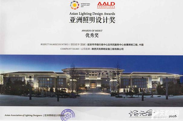 6月8日,2016燈光之夜暨首屆亞洲照明設計獎頒獎典禮在廣州君悅大酒店盛大舉行,由陜西天和照明設備工程有限公司報送的“延安市市級行政中心及市民服務中心照明工程”獲得亞洲照明設計獎“優秀獎”,公司總經理楊總出席…